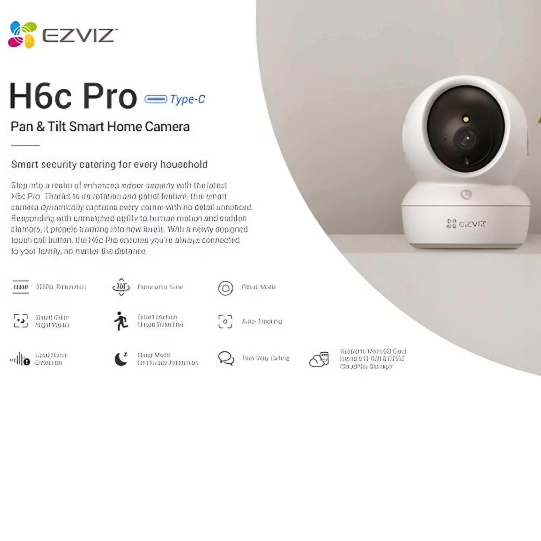 EZVIZ H6C Pro 2K Smart Camera — 360° panoramic view, 2K clarity, AI tracking, night vision & two-way audio. Smart home security made easy.